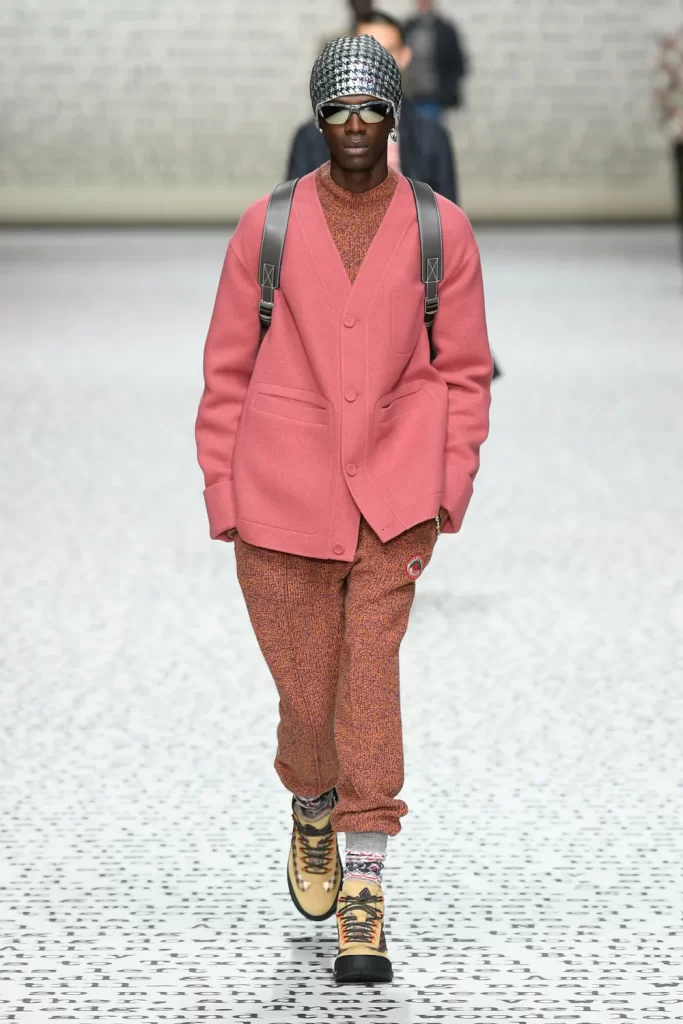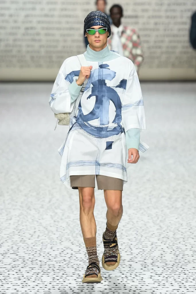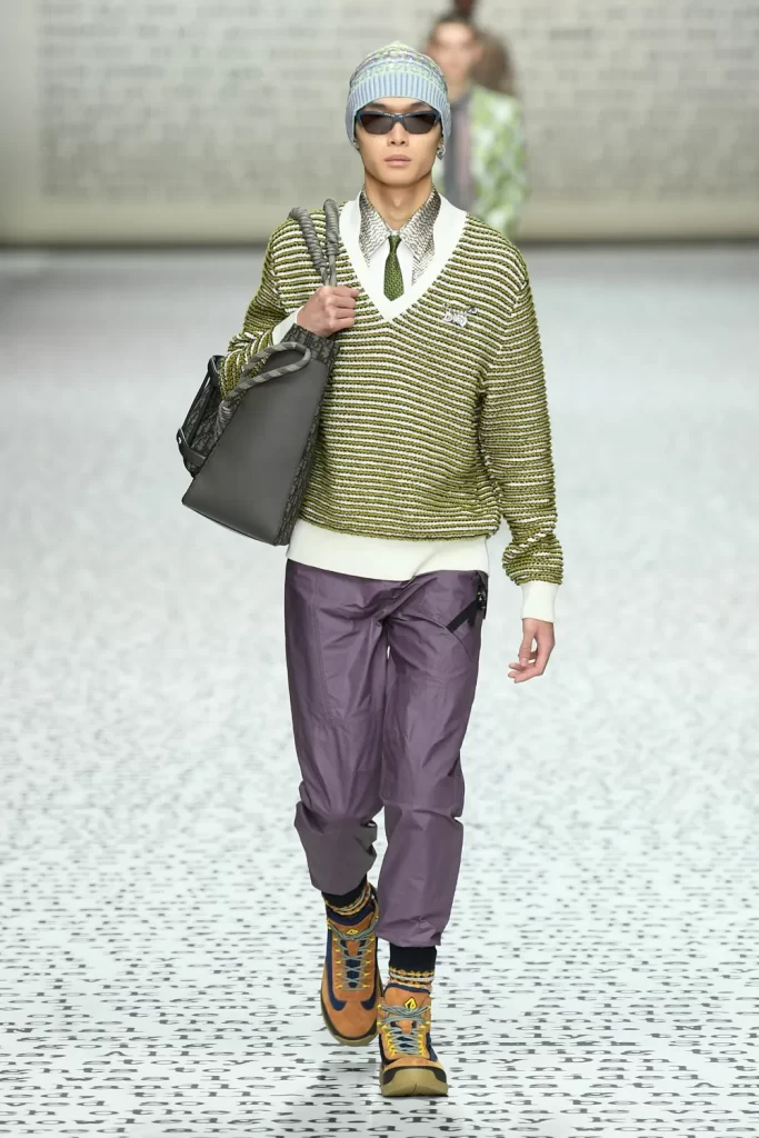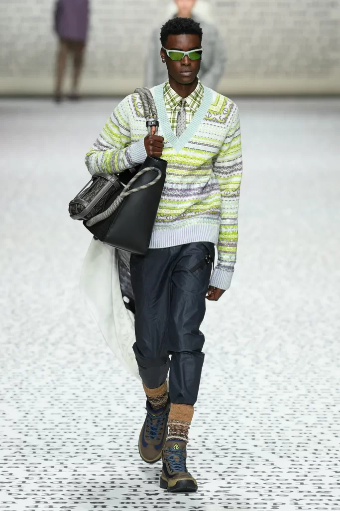 A voluptuous satin sash here, a diamond-look brooch there. In just a year he’s carved a fabulous signature and played no small part in electrifying the Paris menswear scene in the process. Clicking through this pre-collection is a chance to see Jones working in a more minor key and establishing what the Dior Men off-duty vibe looks like. There are elements of street and of sport, both of which are de rigueur at brands even in the highest price bracket. But in these categories too, he’s making use of the house patrimony. Christian Dior was a lover of nature; his garden in the Normandy village of Granville remains a popular tourist destination. He was also knowledgeable about art, having run a gallery before launching his couture label in 1946. Jones brought Monsieur Dior’s two passions together cleverly via one of fashion’s 21st-century preoccupations, a collaboration