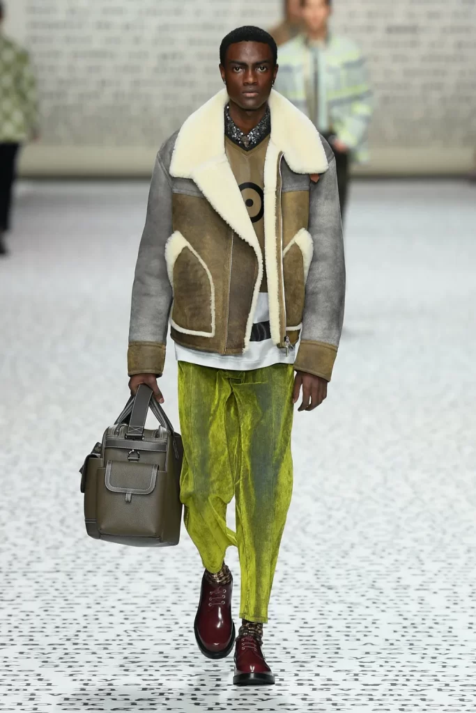 “The Fendi family are women of intellect who work hard – and that’s what I wanted to celebrate,” said Kim Jones. In an ongoing dialogue with them, the artistic director gave Silvia Venturini Fendi the idea of reappropriating the family “F” to create a bag. With its tilted initial “F”, the Fendi First bag was a highlight accessory, presented in myriad variations, from a jewelry micro pouch on a chain to a clutch in different leathers and exotics. This new classic joins the Peekaboo and Sunshine Shopper. Kim Jones’ new Roman empresses showcase the savoir-faire of the House with these luxurious accessories.