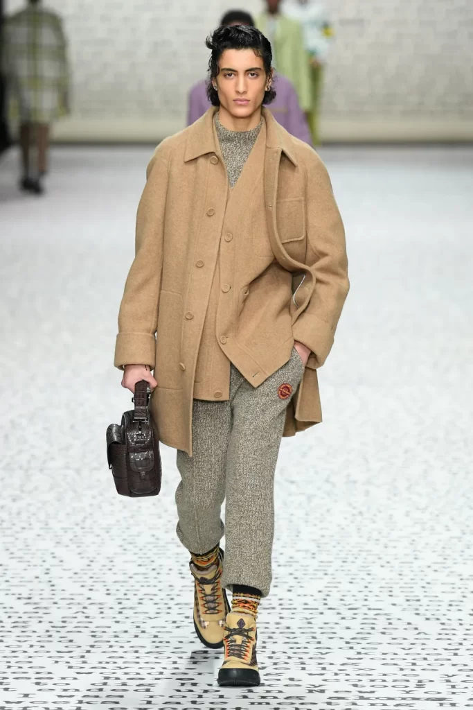 The monochrome silhouettes imagined by Kim Jones walked a runway framed by references to ancient Rome in F-shaped glass boxes. In this contemporary museum décor, the vestiges of antiquity focused a spotlight on contrasts between heritage, savoir-faire and ultra-modernity. Kim Jones found inspiration in the wardrobes of the five Fendi sisters, “a powerful dynasty” that energized the development of the family house by recruiting Karl Lagerfeld in 1965. A palette of camel, powdery pink, taupe, olive green and marble white referenced the different generations of Fendi women. The final silhouettes in sophisticated black were a nod to Delfina Delettrez Fendi, who wore a black tuxedo at her first meeting with Kim Jones. A fourth generation member of the family, she embodies the Maison’s creative future. For the show she introduced a new range of Fendi O’Lock jewelry, an update on the iconic logo in the form of padlocks that can only be opened by dialing FENDI.